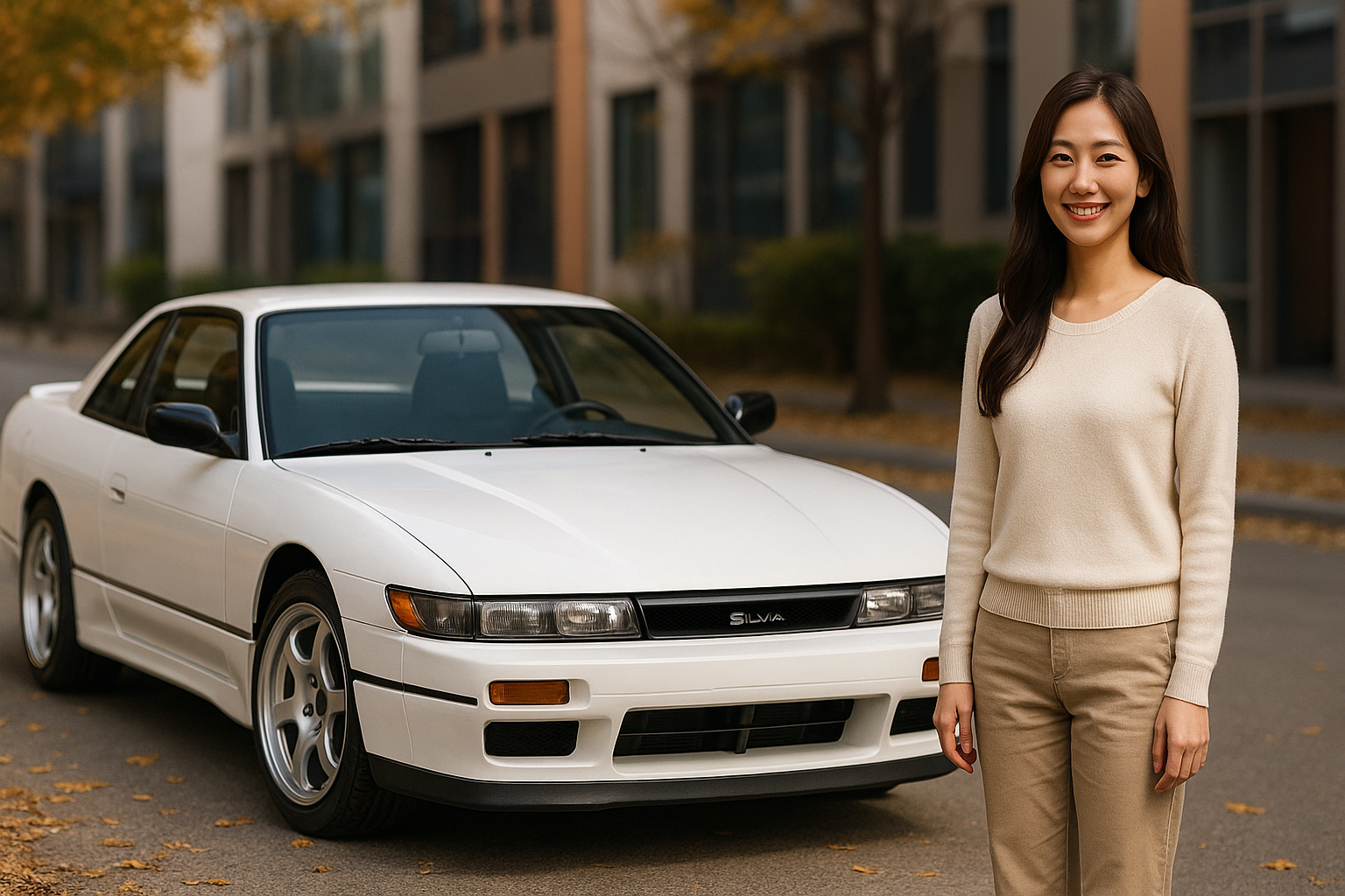 [이미지 2: 닛산 실비아 S13 측면, 여성 모델과 함께]
