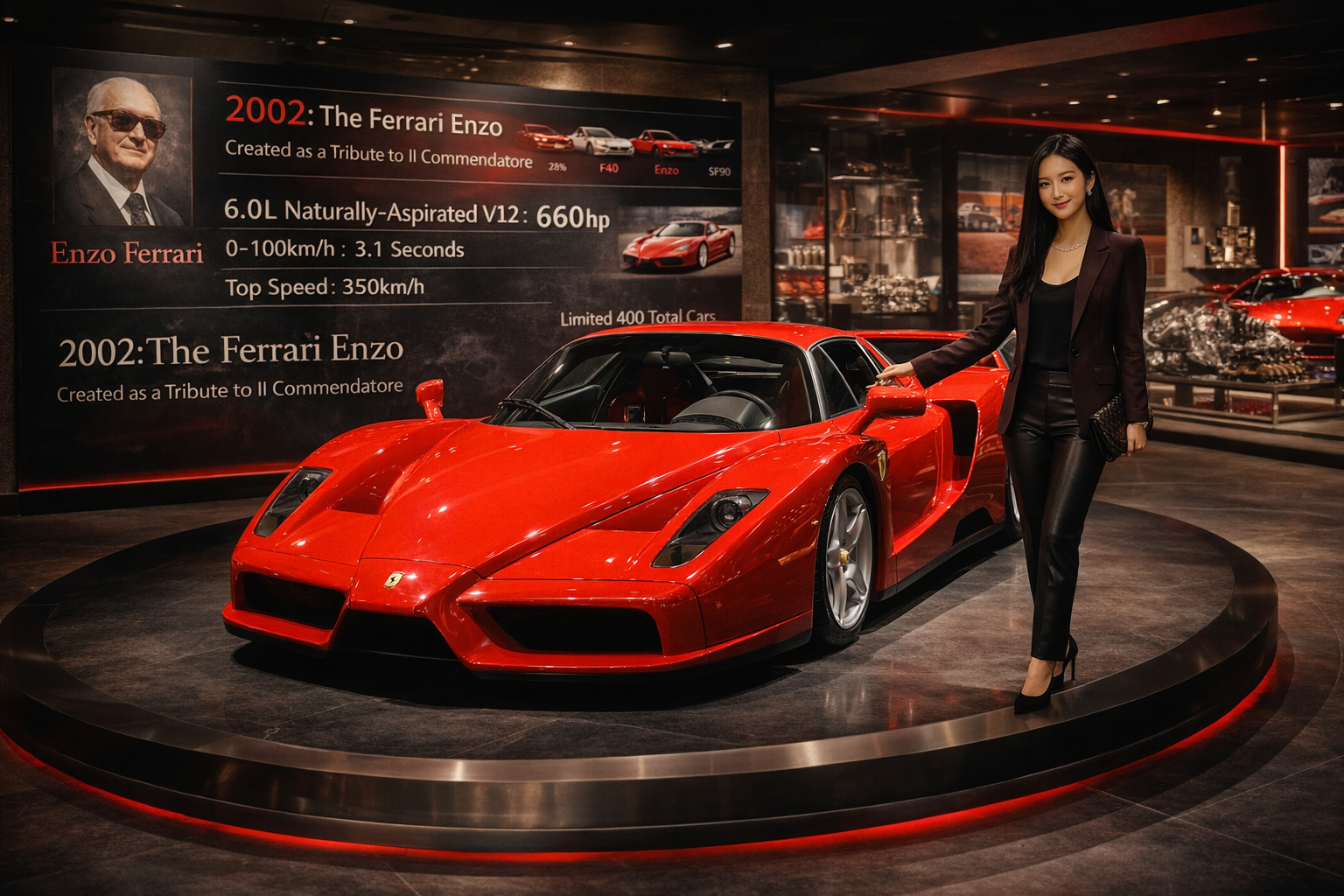 2002년 파리 모터쇼. 페라리가 새로운 하이퍼카를 공개했습니다. 이름은 Enzo. 창업자의 이름을 단 차였습니다. 엔초가 세상을 떠난 지 14년이 지났지만 그의 이름은 살아있었습니다. 6.0리터 V12, 660마력. 최고속도 355km/h. 0-100km/h 3.14초. F1 기술이 집약된 차였습니다. F1 변속기, F1 서스펜션, 카본 세라믹 브레이크. 모두 F1에서 가져온 기술이었습니다.
