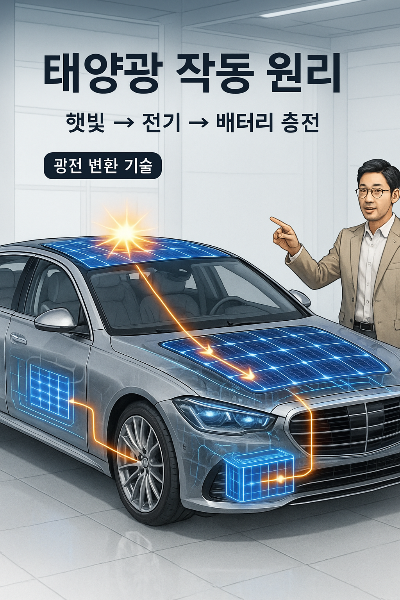 태양광 자동차의 핵심 기술은 광전 변환(Photovoltaic) 기술입니다. 태양광 패널에 포함된 실리콘 반도체가 햇빛을 받으면 광전 효과에 의해 전자가 움직이면서 직류 전기를 생산합니다. 이 전기는 인버터를 통해 교류로 변환되어 배터리에 저장되거나 직접 모터에 공급됩니다.